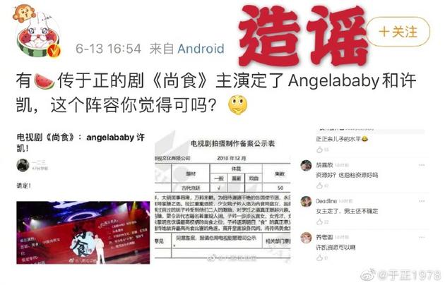 6月15日,于正在微博辟谣网传Angelababy出演其新剧《尚食》一事,并发文否认了吴谨言不受宠的传闻。