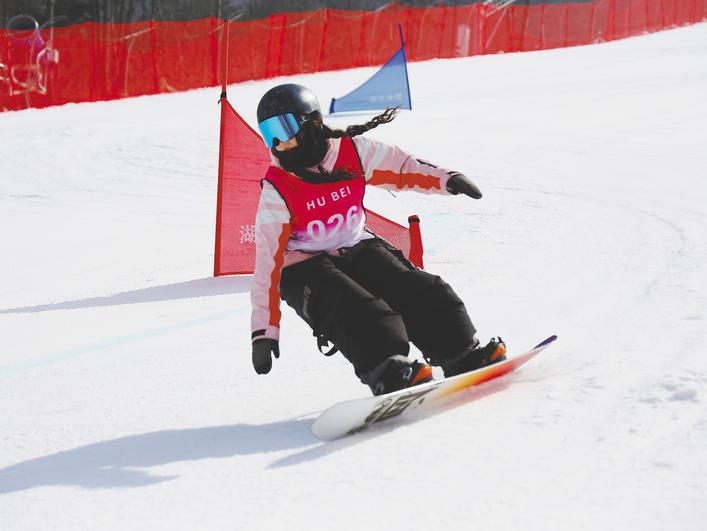 200米长的洁白雪道上,红蓝两色的旗门标定出比赛路线。选手们身穿鲜艳的滑雪服,脚踏雪板,在高速下滑中,灵活地绕过一个又一个旗门,身上的飘带随风起舞,尽显青春活力。