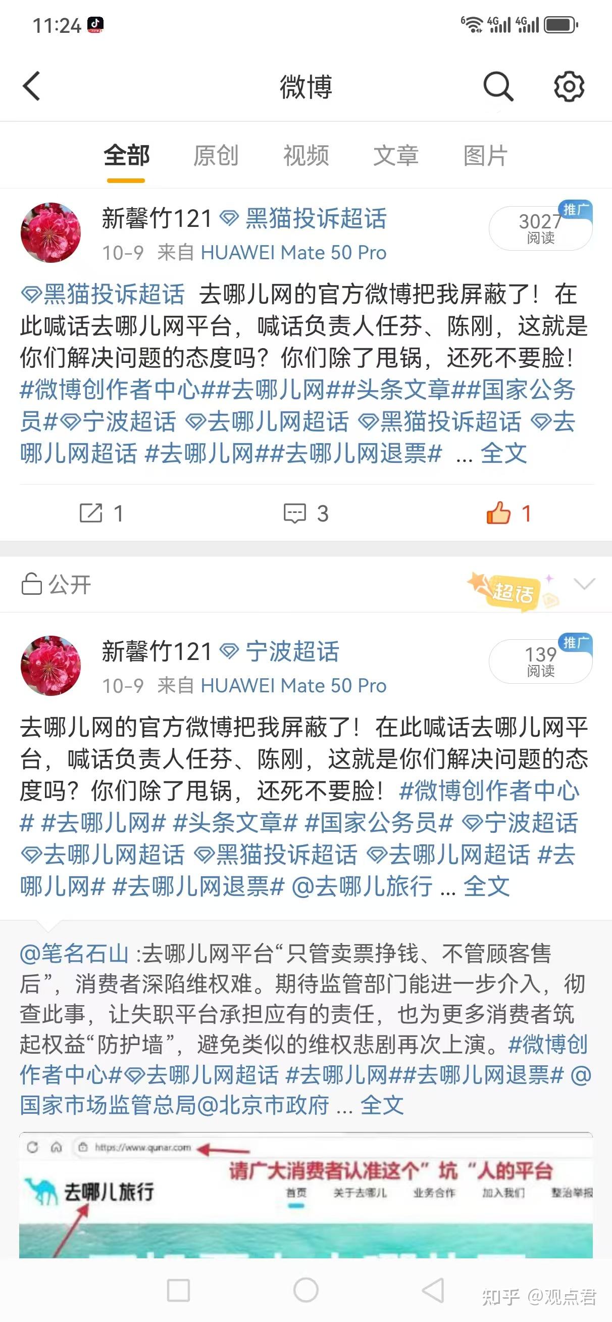 9月29日,在12345投诉无果后,我在微博发布遭遇并@去哪儿网官方微博,换来的却是账号被举报,博文被屏蔽,以及格式化回复:“作为第三方平台,信息来源于航司,预定时已弹窗提示风险”。