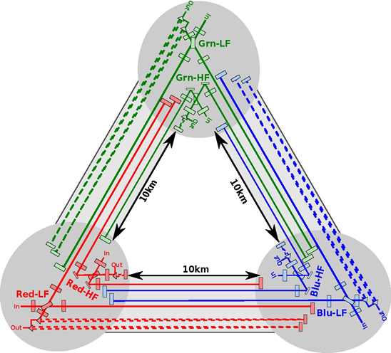 而欧洲也想打造这样一台梦想中的探测器,称其为“爱因斯坦望远镜”,简称为“ET”。据悉,它将由三条10公里长的探测臂构成,在地下组成一个巨大的三角形。选址可能包括地中海中的撒丁岛、以及由荷兰、比利时和德国三国边境构成的三角形等等。
