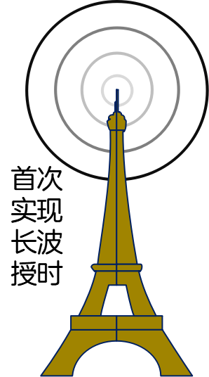 长波授时:长波是频率在30千赫兹-300千赫兹、波长在1千米~10千米的无线电波,其可通过地波(大地传导)和天波(电离层反射)传播。1910年,法国人首次在举世闻名的埃菲尔铁塔顶端选用长波无线电信号发射器实现报时。